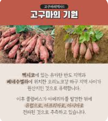 멕시코와 콜롬비아 지역이 원산지로 알려져 있으며 16세기에 스페인에 의해 유럽으로 전파되었습니다. 그 후 고구마는 아시아와 아프리카 등 여러 지역으로 확산되었으며, 각 지역에서 자신들의 요리와 문화에 맞게 소비되고 재배되었습니다.