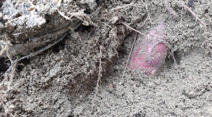 - 고구마 줄기를 잡고 들어 올리는 과정에서 고구마가 부러지는 경우가 있으니 최대한 흙을 파며 서두르지 않고 조심조심 수확합니다.