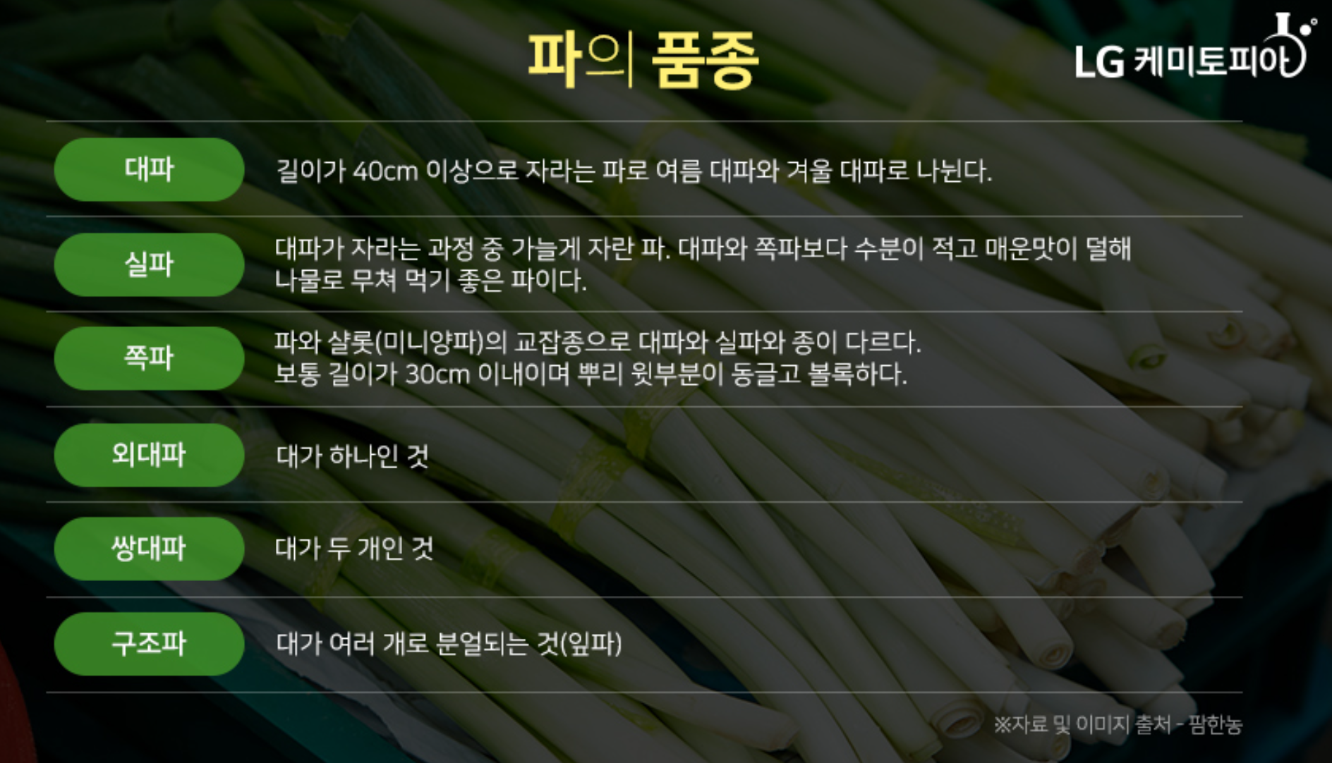 한국농수산식품유통공사에서 제작한 대파관련 파일을 첨부하오니 필요하신 분들은 다운받아서 읽어보시기 바랍니다.