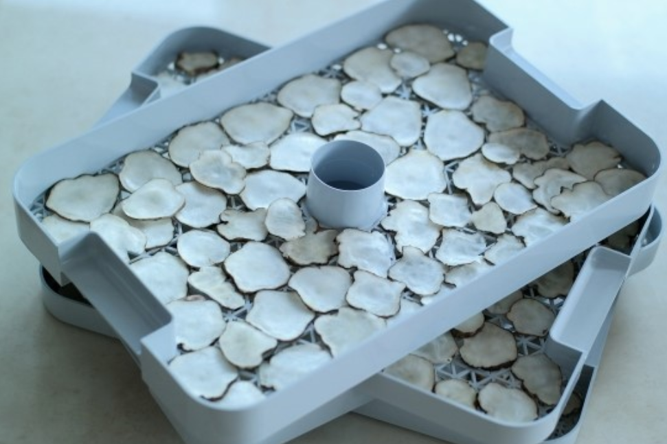 썰어놓은 돼지감자를 식품건조기나 채반에 놓고 말립니다. 돼지감자를 말릴 때 햇볕이 너무 강하면 돼지감자가 탄 채 말려질 수 있어서 햇볕이 너무 강한 곳보다는 그늘에서 말리는 것이 좋다고 합니다.