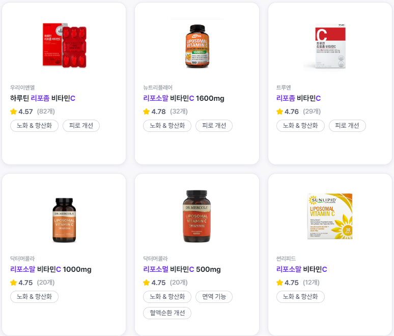 국내에서 시판되는 리포좀 비타민 C 제품들은 아직 많지 않으며, 특히 식약처에서 건강기능식품으로 인증받은 브랜드는 제한적입니다.