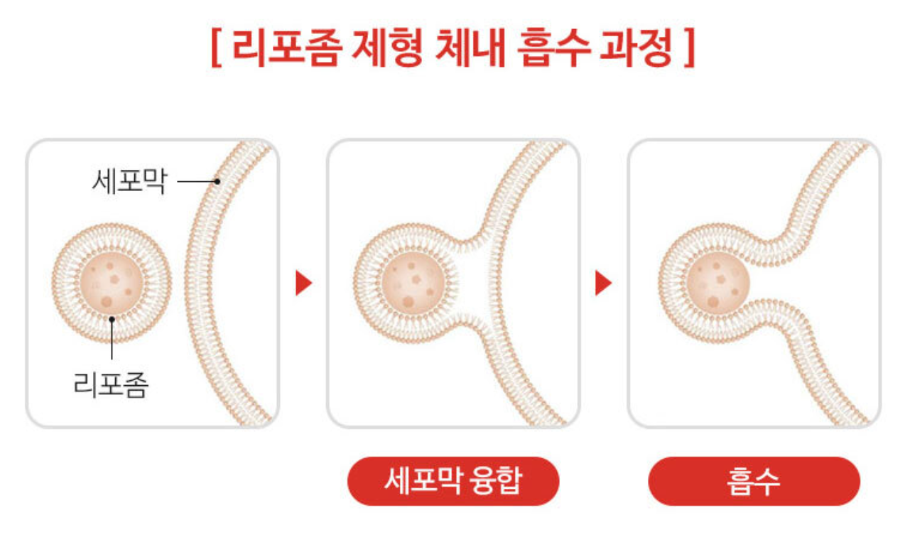 | 흡수방식 | 수용성으로, 소화기관을 통해 흡수됩니다. 고용량 복용 시 위장 장애를 일으킬 수 있으며, 흡수율이 낮을 수 있습니다. | 지질 이중막으로 감싸져 있어 소화기관을 통해 더 효과적으로 흡수되고, 위장 장애가 적습니다. |