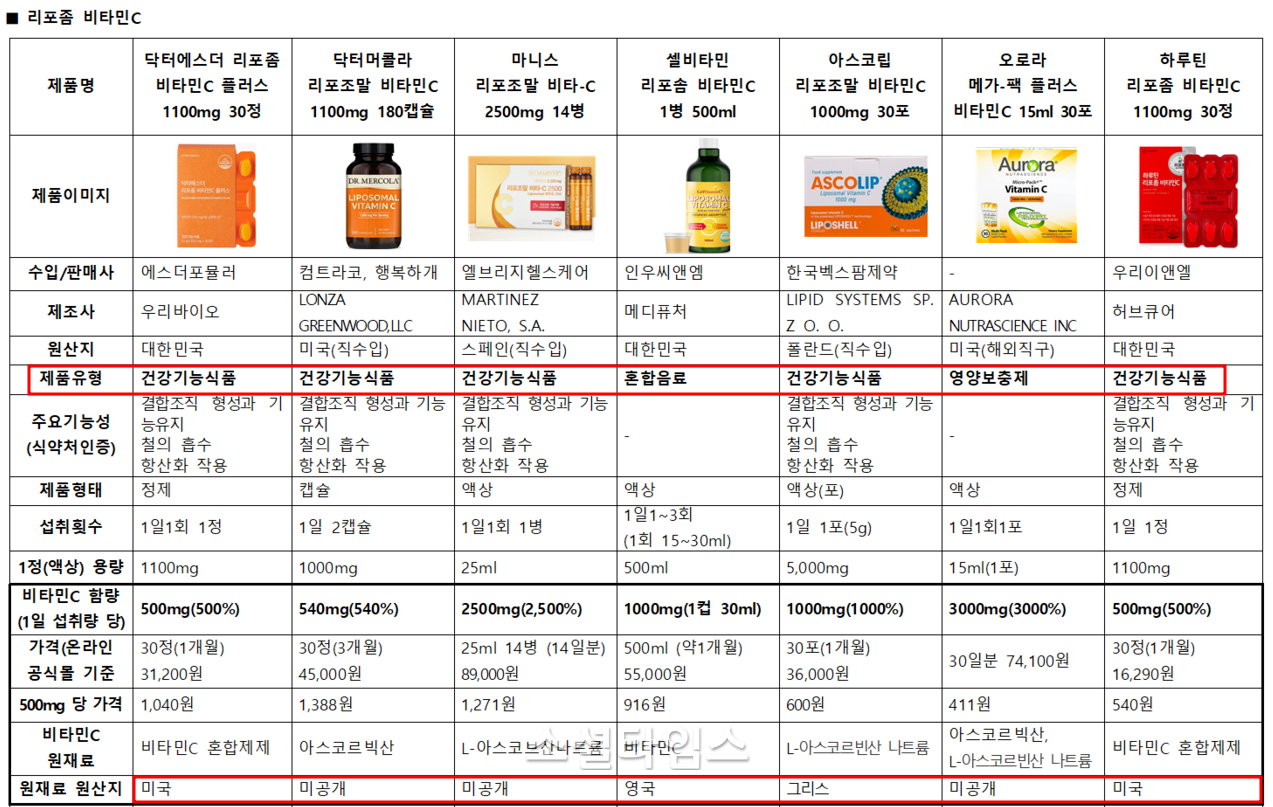 비교 대상 7개 제품 중, 국내 생산된 건강기능식품은 닥터에스더 리포좀 비타민C 플러스와 셀비타민 리포솜 비타민C가 있으며, 혼합음료 형태의 국산 제품인 하루틴 리포좀 비타민C도 있습니다.