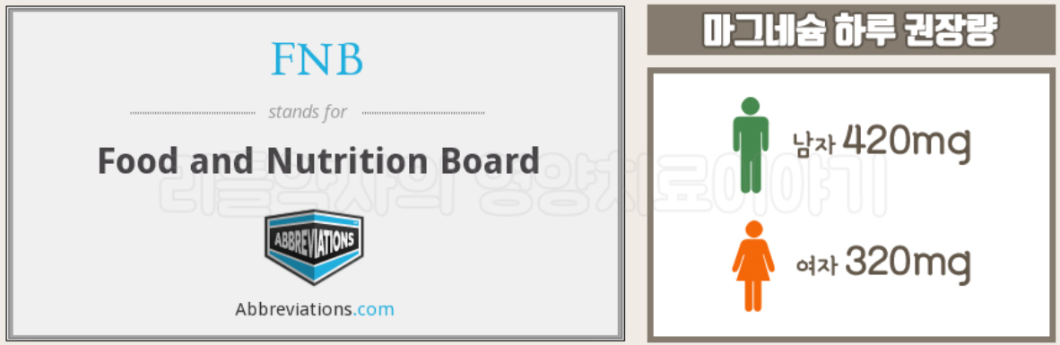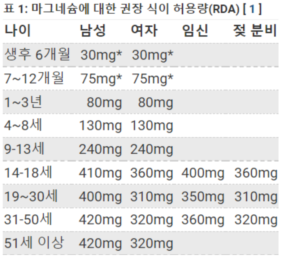 참고로 미국식품 및 영양위원회에서는 마그네슘 하루섭취량을 남자는 420mg, 여자는 320mg정도로 제시하기도 했습니다.