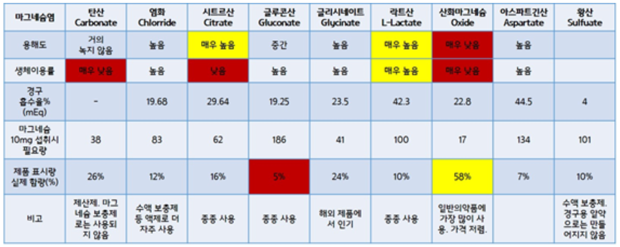 - 마그네슘 비율이 가장 높지만, 흡수율이 낮고 속쓰림이나 설사와 같은 부작용이 생길 수 있습니다.