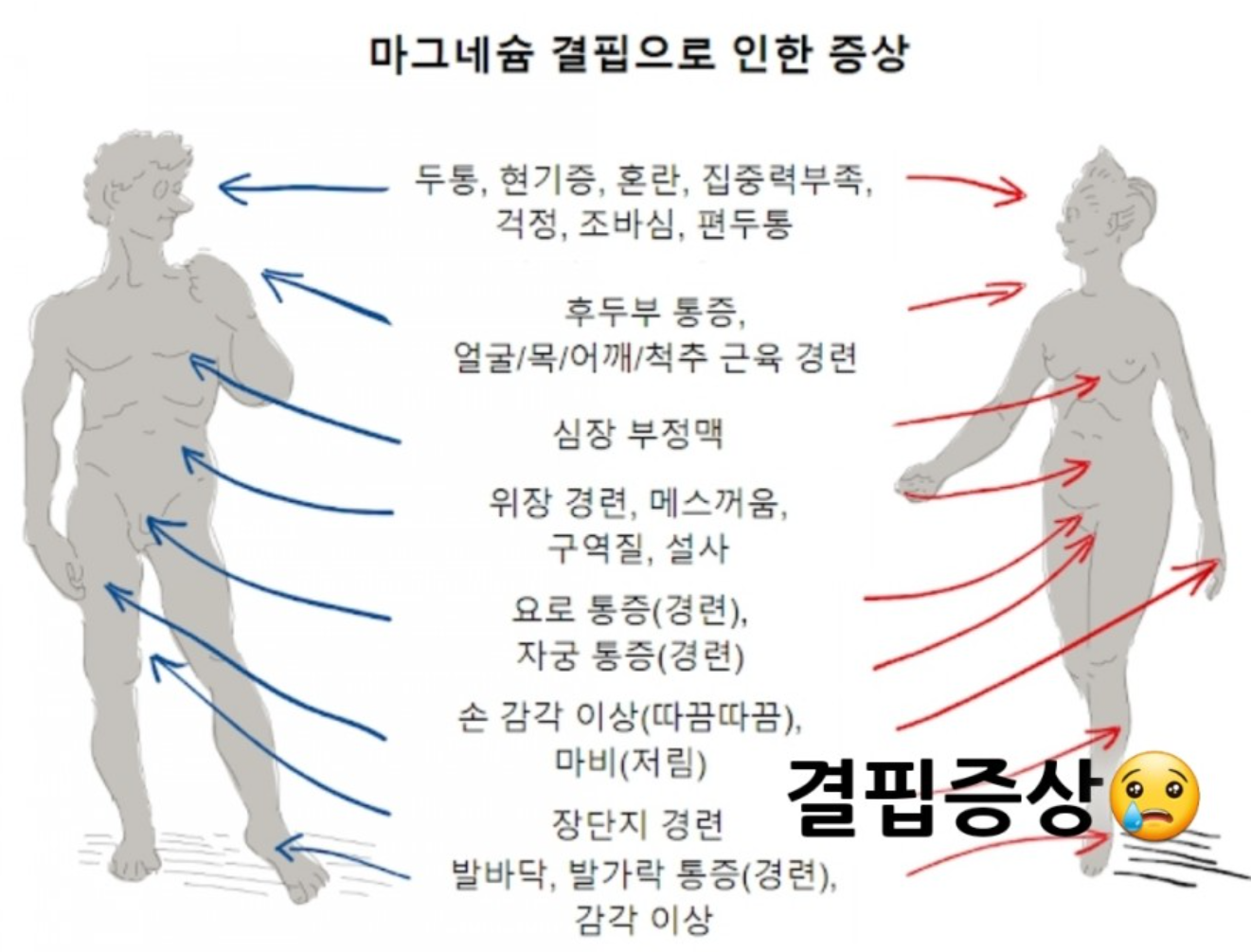 마그네슘 부족현상은 다양한 증상을 동반하며 일반적으로 아래과 같은 증상들이 나타날 수 있습니다.
