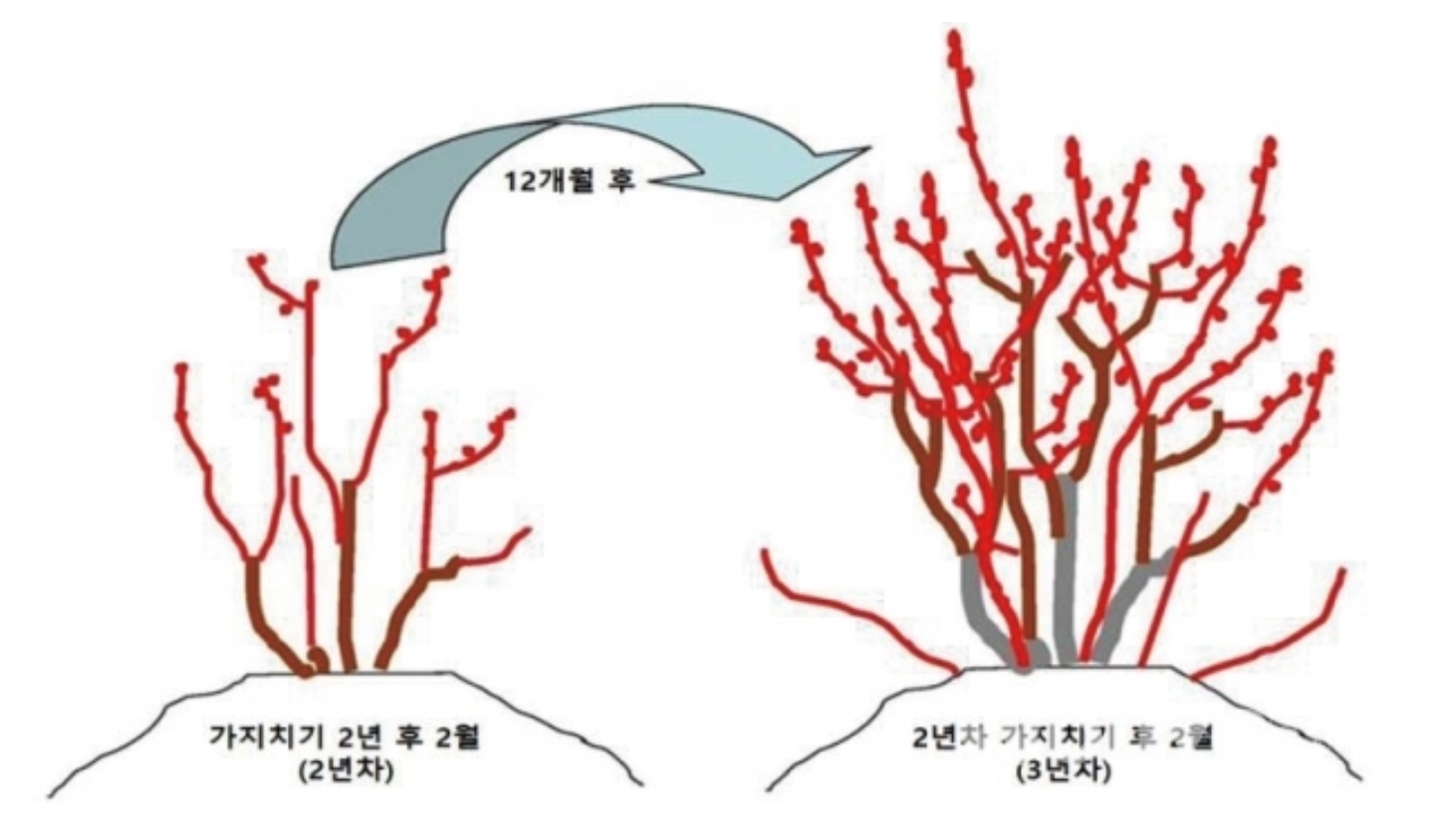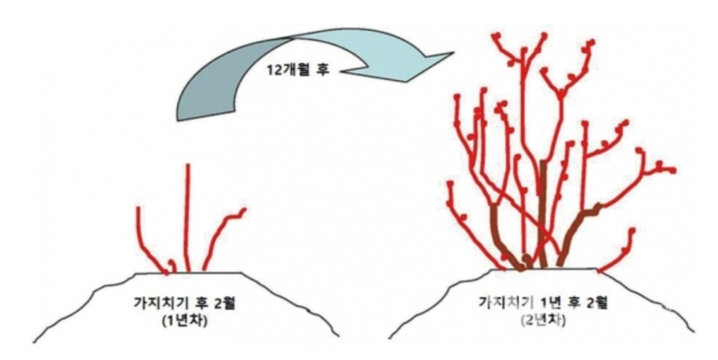 전정 묘목을 심고 난 직후에는 쇠약하거나 병든 가지 또는 부러진 가지를 잘라내고 꽃눈은 모두 따줍니다.