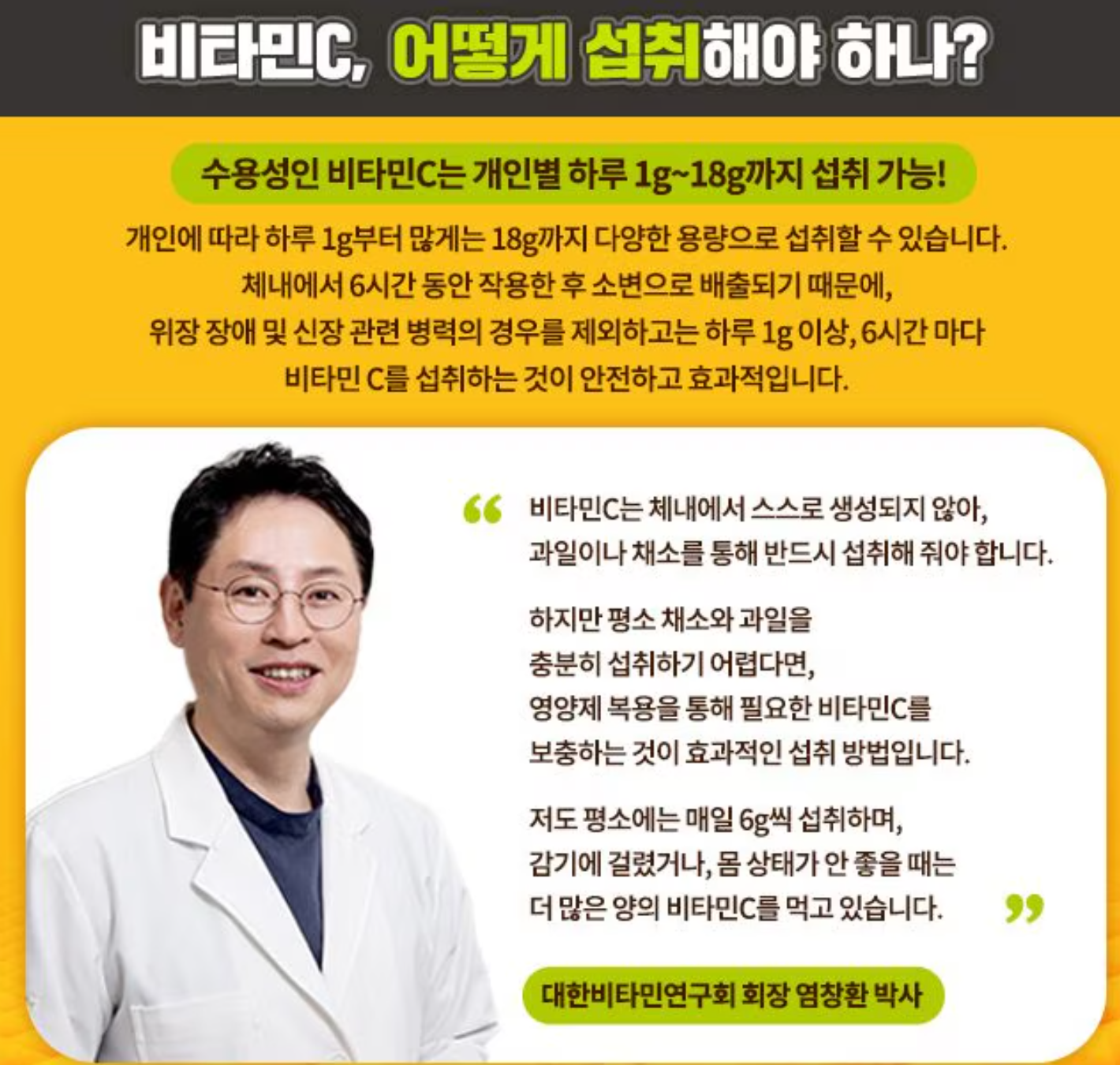 - 비타민C는 몸에서 오래 저장되지 않기 때문에 하루에 한 번 많은 양을 복용하는 것보다 여러 번 나누어 복용하는 것이 더 효과적일 수 있습니다.