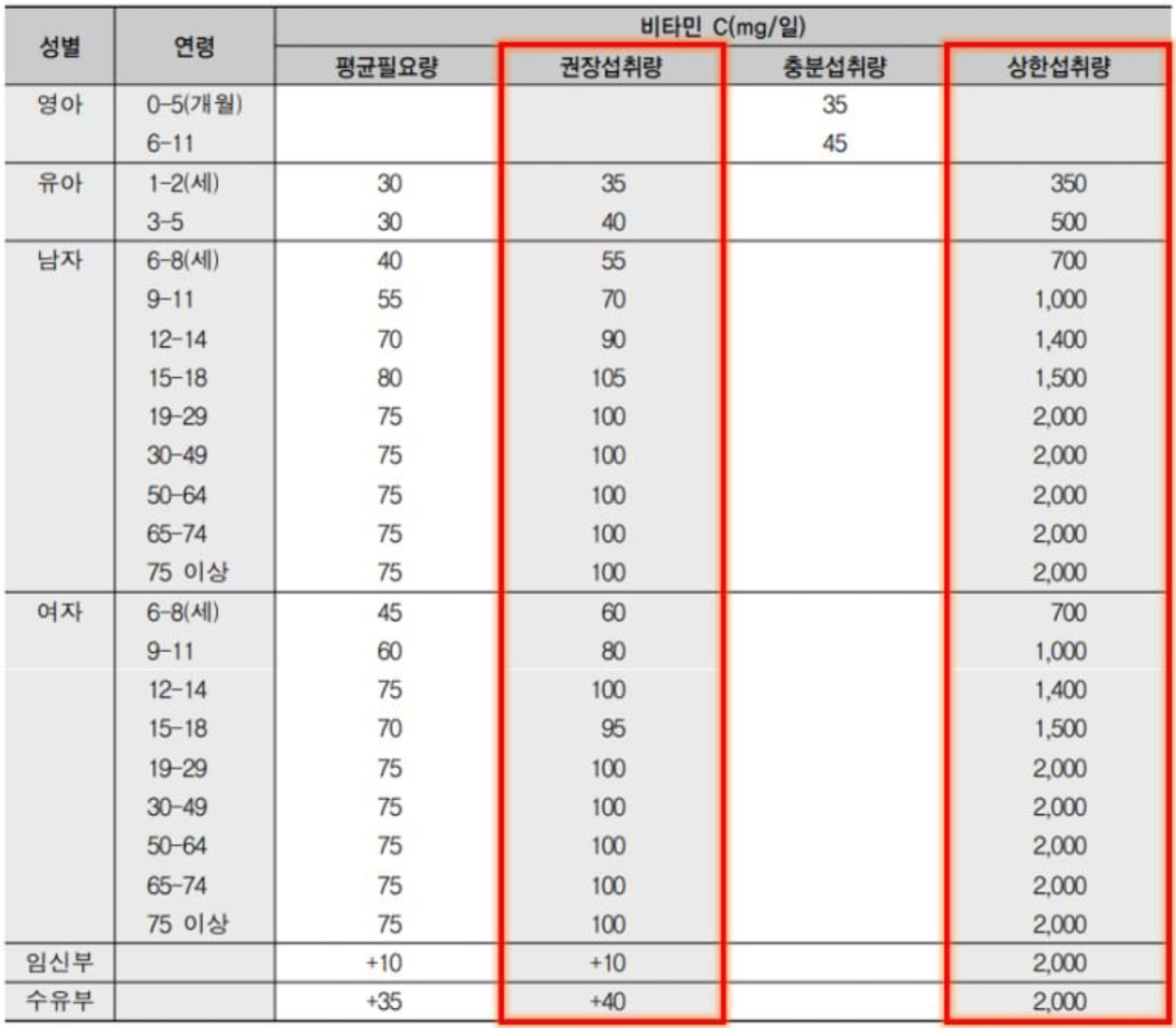 연령대별 권장량