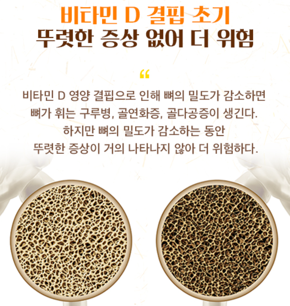 - 비타민D는 칼슘과 인의 흡수를 촉진하여 뼈를 강하게 하고 골다공증 예방에 도움을 줍니다. 특히, 65세 이상 노인이나 골다공증 진단 환자에게 효과적입니다.