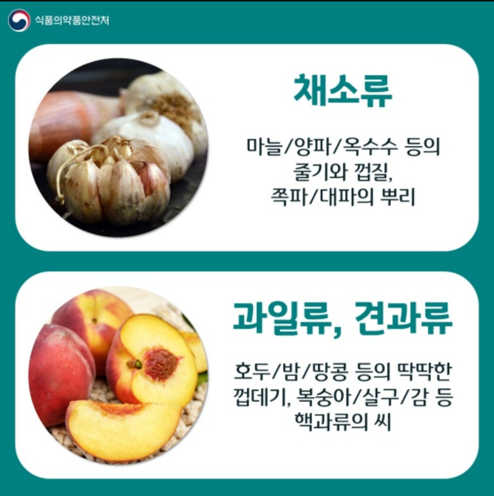 - 과일류, 견과류 : 호두/밤/땅콩 등의 딱딱한 껍데기, 복숭아/살구/감 등 핵과류의 씨