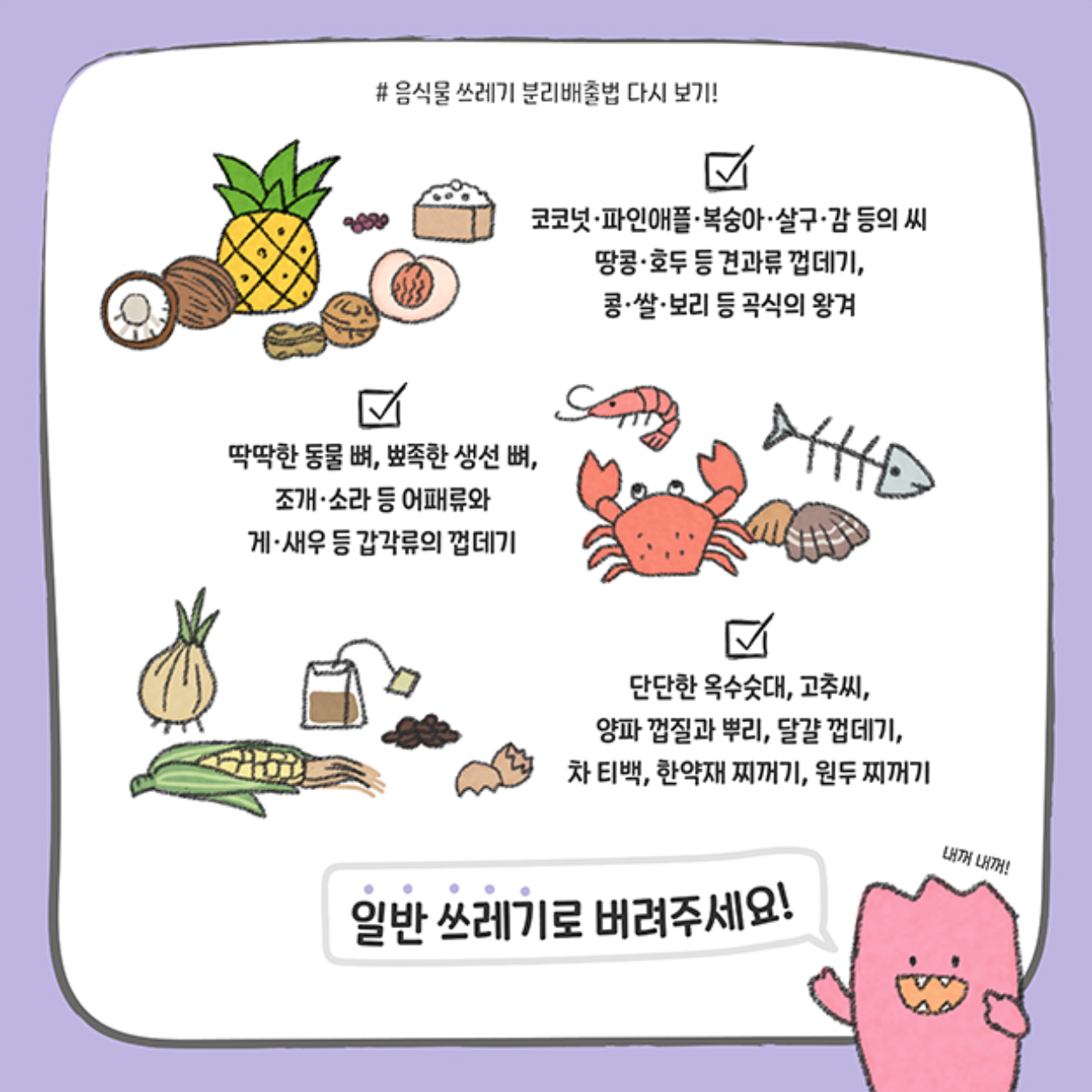 음식물 쓰레기를 효율적으로 배출하기 위해서는 음식물 쓰레기와 일반 쓰레기를 잘 분류하는 것이 중요합니다. 아래 내용은 음식물이지만 일반 쓰레기로 분류해야 하는 것들이니 꼭 기억해주시기 바랍니다.