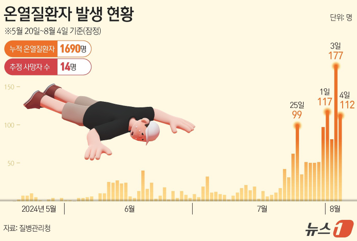 2024년 현재까지 온열질환으로 인한 사망자는 14명에 달하며, 이는 전년 대비 급증한 수치입니다.
