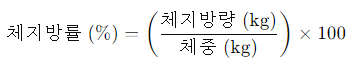 | 체지방률 | 몸 전체에서 지방이 차지하는 비율 | 백분율 (%) | 체지방량 ÷ 체중 × 100 |