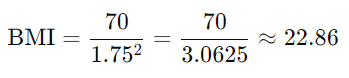 예를 들어, 체중이 70kg이고 신장이 1.75m인 사람의 BMI는 다음과 같이 계산됩니다.